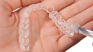 その後、カスタムトレイ上の対象歯に一本線を描くようにジェルを注入します。