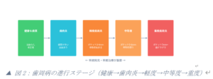 ▲ 図2:歯周病の進行ステージ(健康→歯肉炎→軽度→中等度→重度)