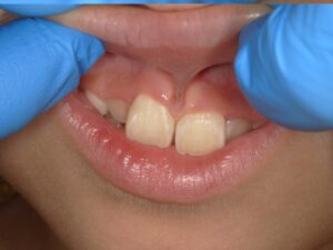お口の中には小帯といわれる筋(スジ)のような構造物がベロと唇に付着しています。この小帯の異常が歯ならびにも悪い影響を及ぼすことがあります。子供によくみられる小帯の異常は上唇小帯の高位付着です。スジが前歯の間に入り込んでしまうことで正中離開(空隙歯列の一つ)を起こしやすくなります。